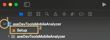 axeDevToolsMobileAnalyzer.xcodeprojto open the project in Xcode. - In Xcode's left file navigation panel, expand the project by selecting the chevron (1), then open the