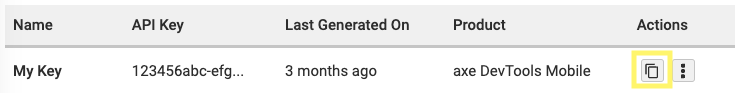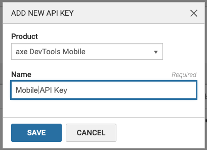 - If you don't yet have an API key for axe DevTools Mobile, click ‘+ Add New API Key’. Select axe DevTools Mobile and give your API key a name. You can name this anything you'd like, such as ‘Mobile API Key’.