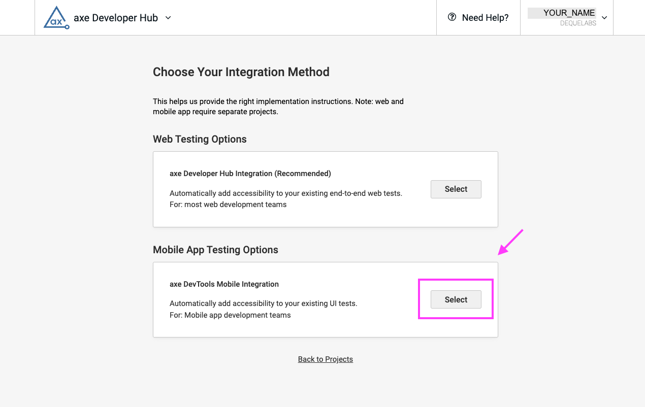 Nachdem Sie ein neues Projekt hinzugefügt haben, wählen Sie eine Integrationsmethode zur Erfassung von Barrierefreiheitsdaten aus. Wählen Sie die axe DevTools Mobile Integration.