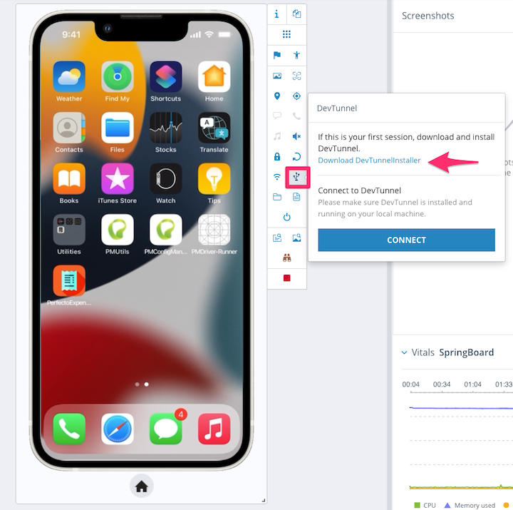 Starten Sie "DevTunnel", falls Sie dies nicht bereits in einem vorherigen Schritt getan haben: Wählen Sie auf Perfecto in der Geräteoberfläche die Schaltfläche „DevTunnel“ und dann „Verbinden“. Hinweis: Durch das Öffnen von DevTunnel vor Xcode wird sichergestellt, dass Ihr Cloud-Gerät für Xcode verfügbar ist.