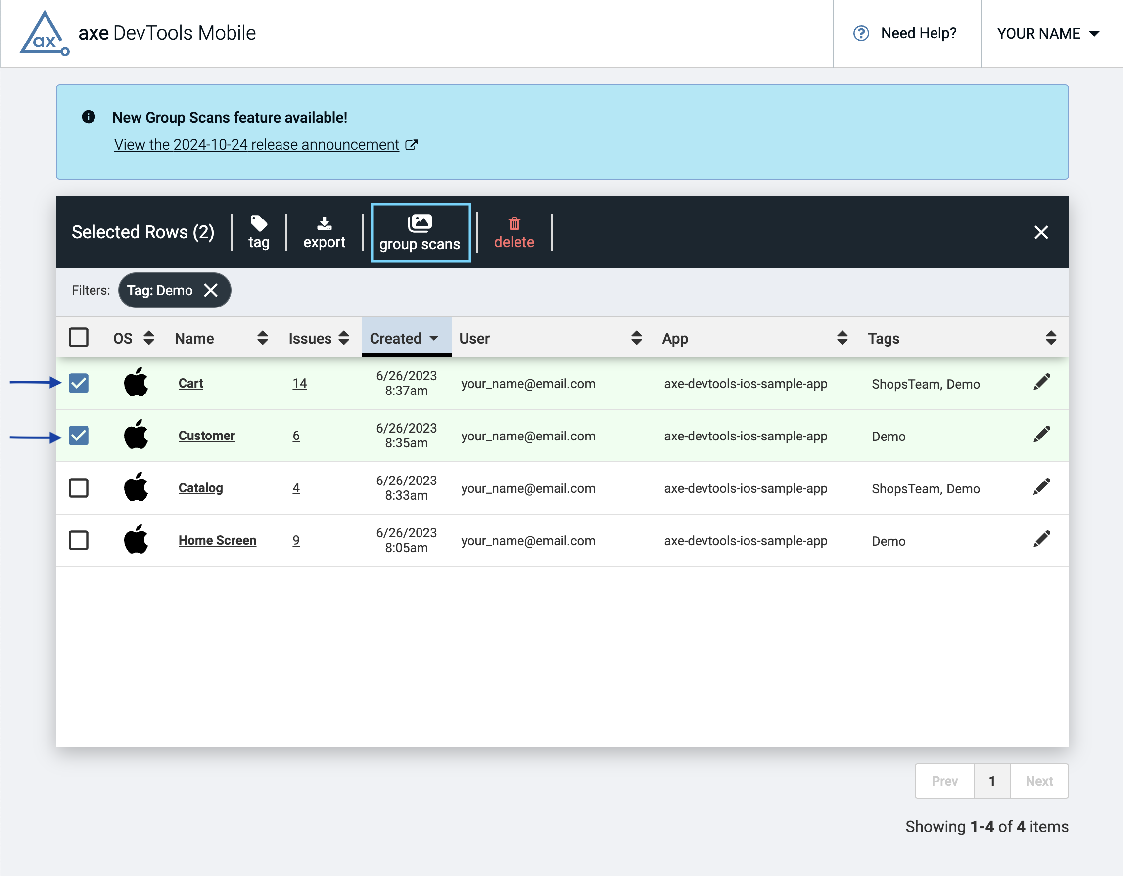 - Check the boxes in the left-hand column of the table to select the scans you wish to group. A banner will pop up above the table, and you will select the option to Group scans. After confirming, the group scan will load on a new page.