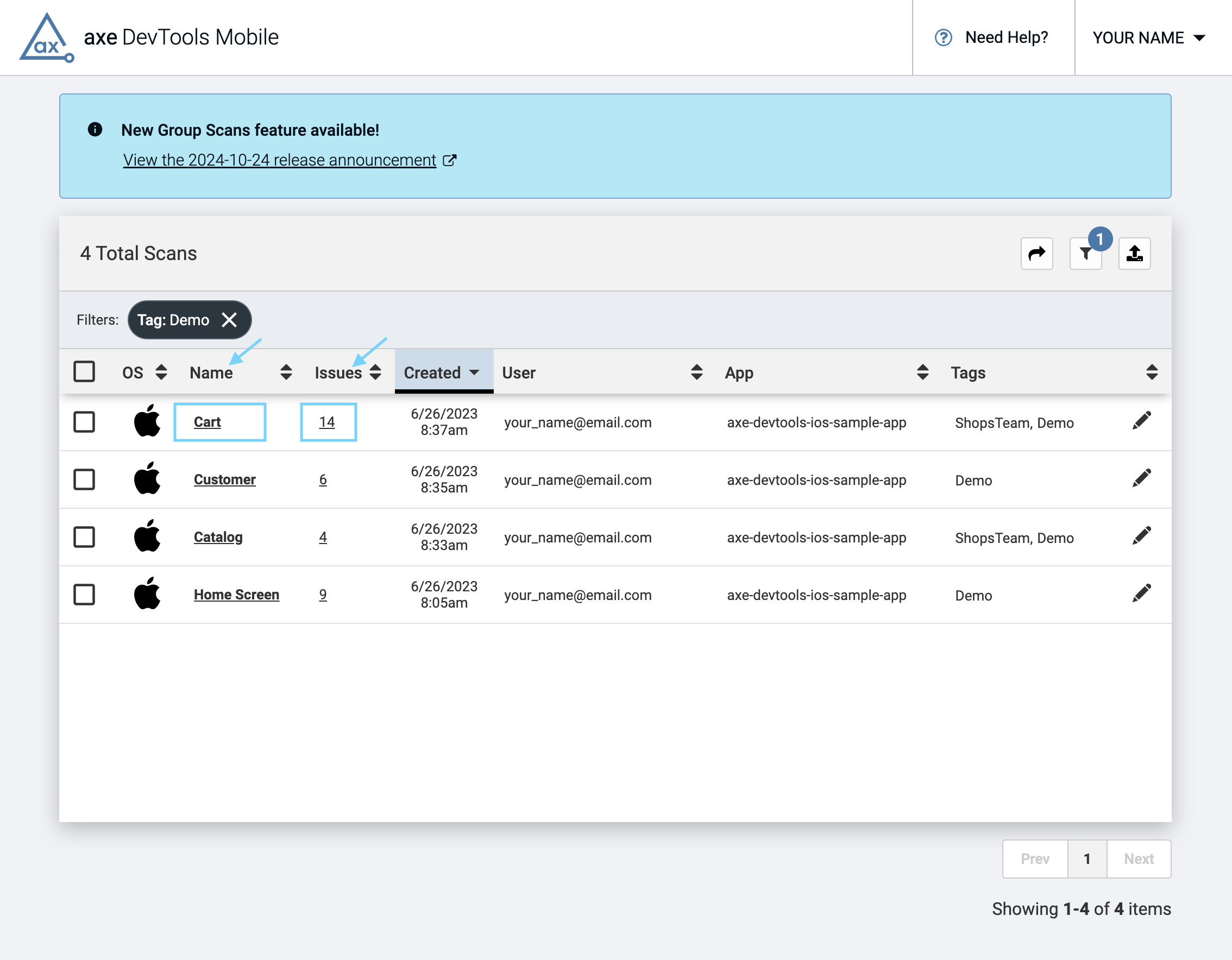 - Click on the Name of the scan or the Issue count for that screen. The scan will load on a new page.