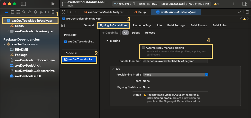 Open the axe DevTools Mobile Analyzer Project in Xcode and follow the steps outlined in the screenshot below.