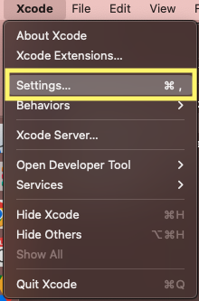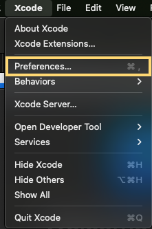 - In Xcode, in the Operating System's top menu bar, select ‘Xcode’ then ‘Preferences’ or ‘Settings’