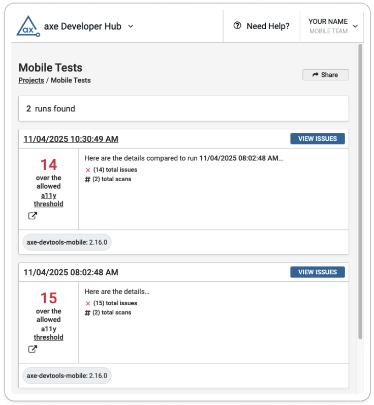 En este momento, puede encontrar resultados tanto en el Dashboard axe DevTools Mobile como en axe Developer Hub. Sin embargo, el Mobile Dashboard eventualmente será retirado en favor de Developer Hub. Durante la transición, usted podrá acceder a sus resultados en ambos lugares.