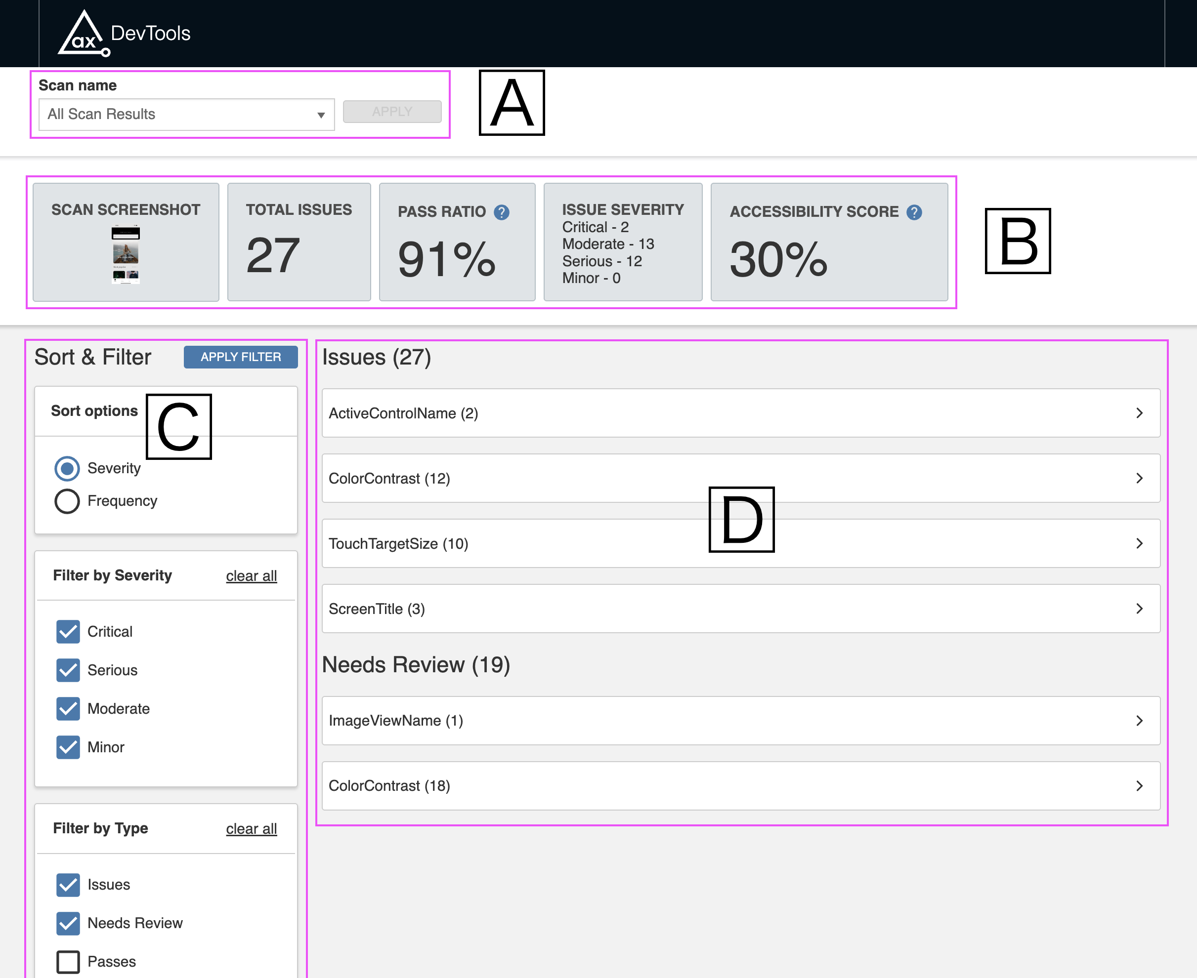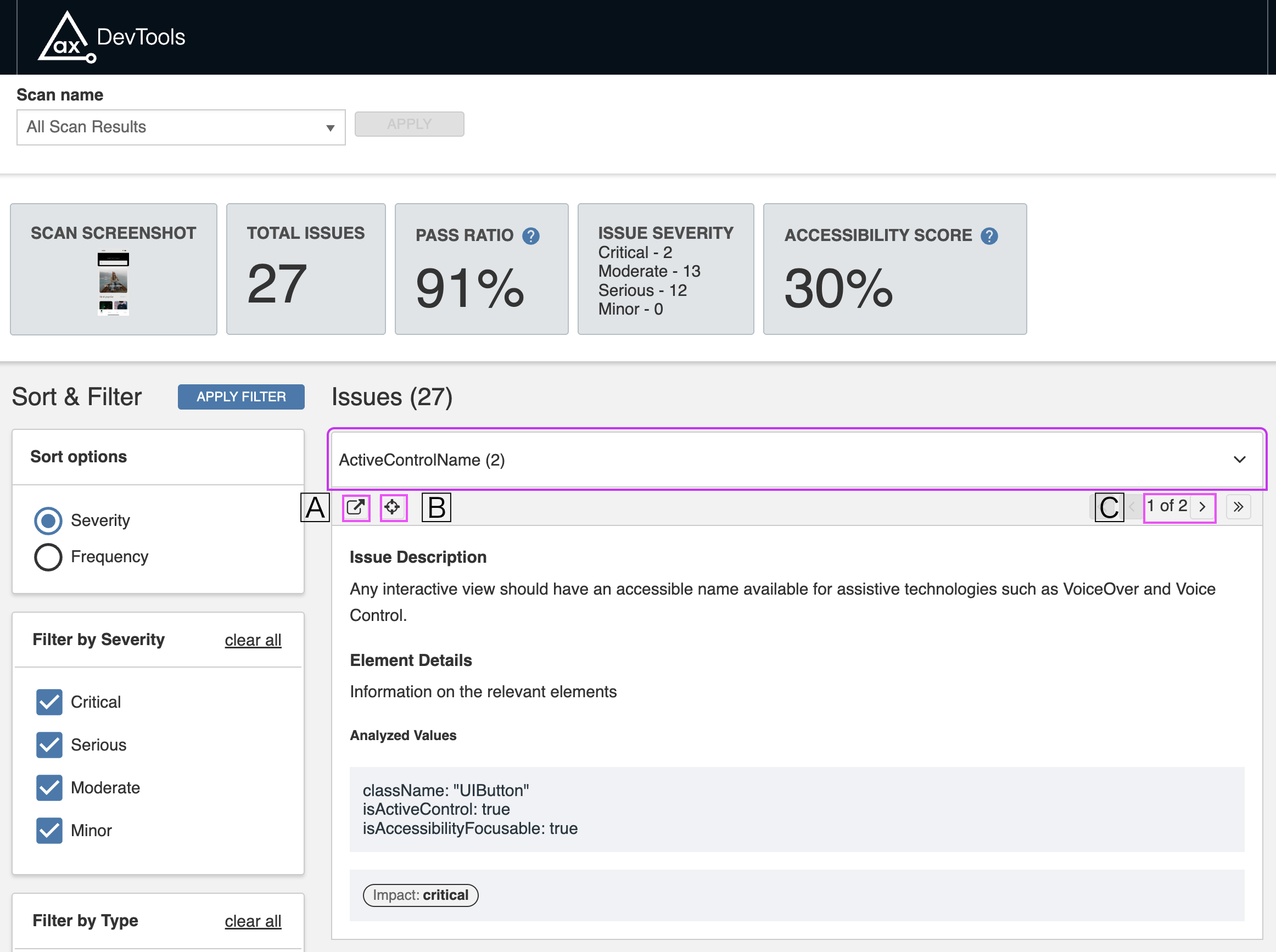 🄰 - Vai alla pagina delle regole per saperne di più sul tuo problema di accessibilità e su come risolverlo. 🄱 - Vedi il problema evidenziato nello screenshot. 🄲 - Passare all'istanza successiva di questo problema di accessibilità.