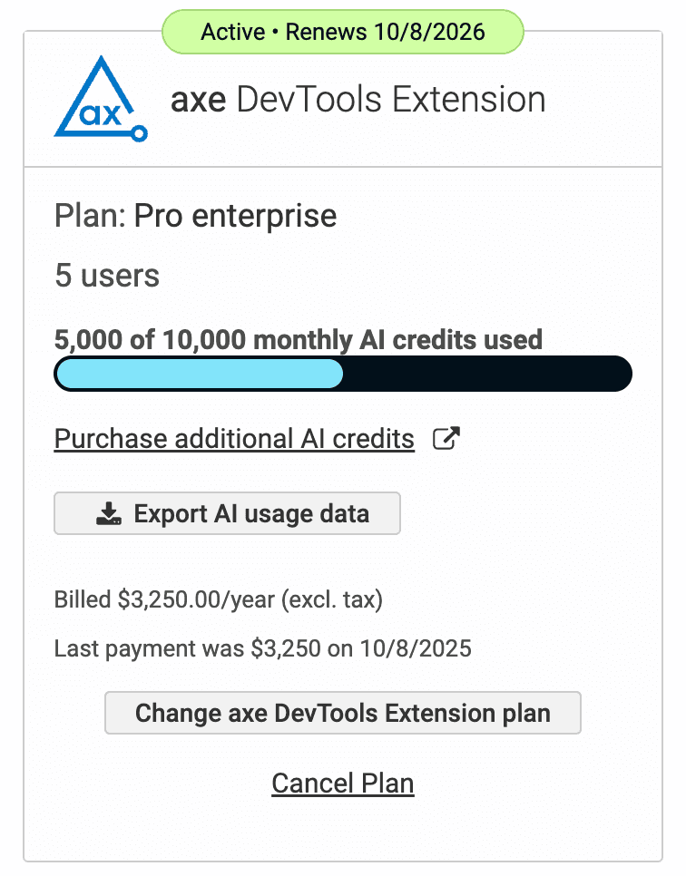 Each enterprise (or single license holder) with an axe DevTools Extension and/or axe DevTools for Web subscription receives a monthly allocation of AI credits that automatically resets at the beginning of each billing cycle. For multi-user enterprises, credits are managed at the enterprise level, allowing any team member with access to share from a common pool.