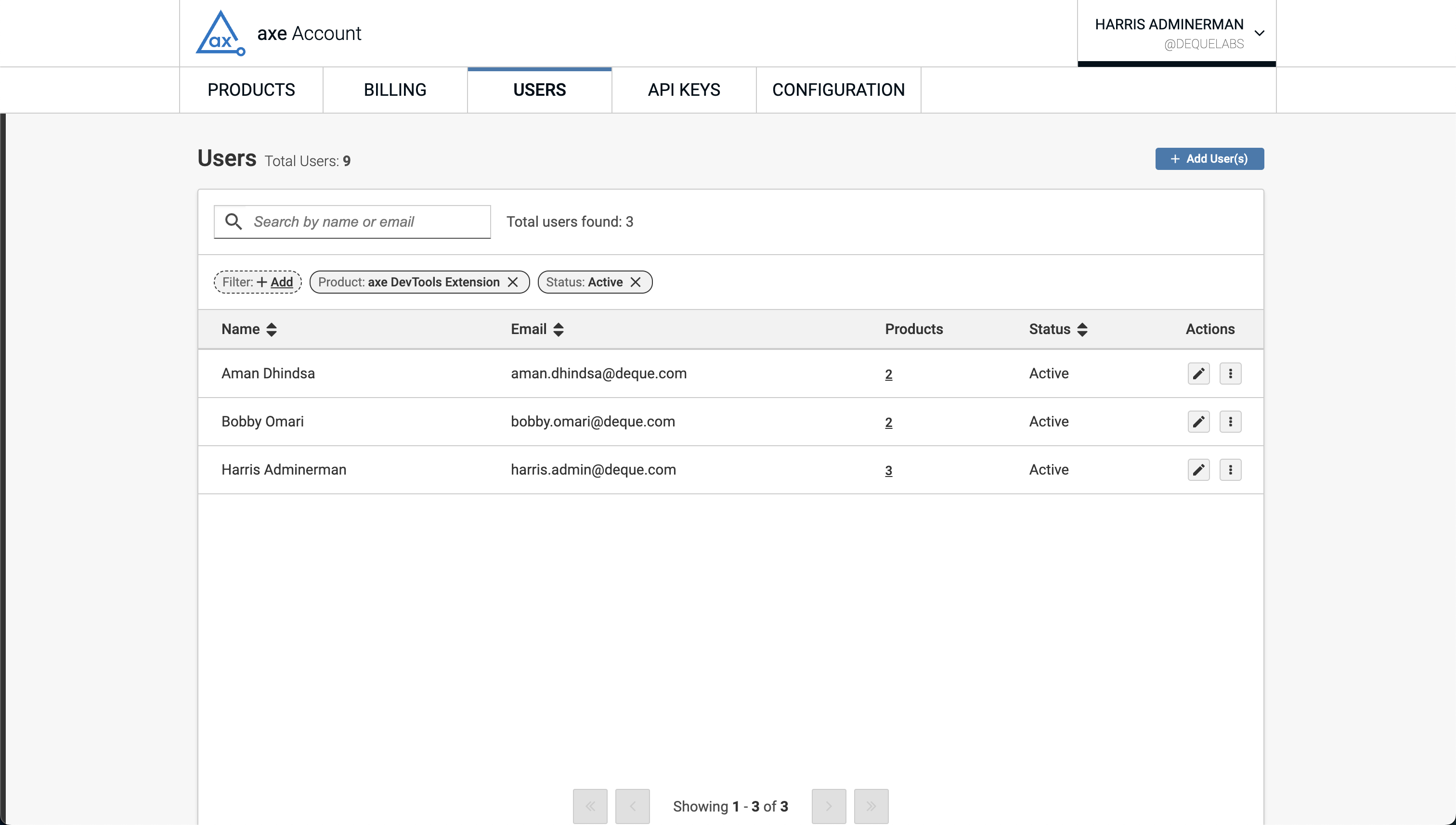 The "User Management" page is where administrators can manage their users' roles and access. Each user will be displayed in the "Manage Users" table. Within the table you can find each user's name, email address, product access, roles, and access status. You can also edit each user's role and access, resend a pending invitation, and delete a user. Admins can also add users to each product they have active subscriptions with and invite new axe Account admins.