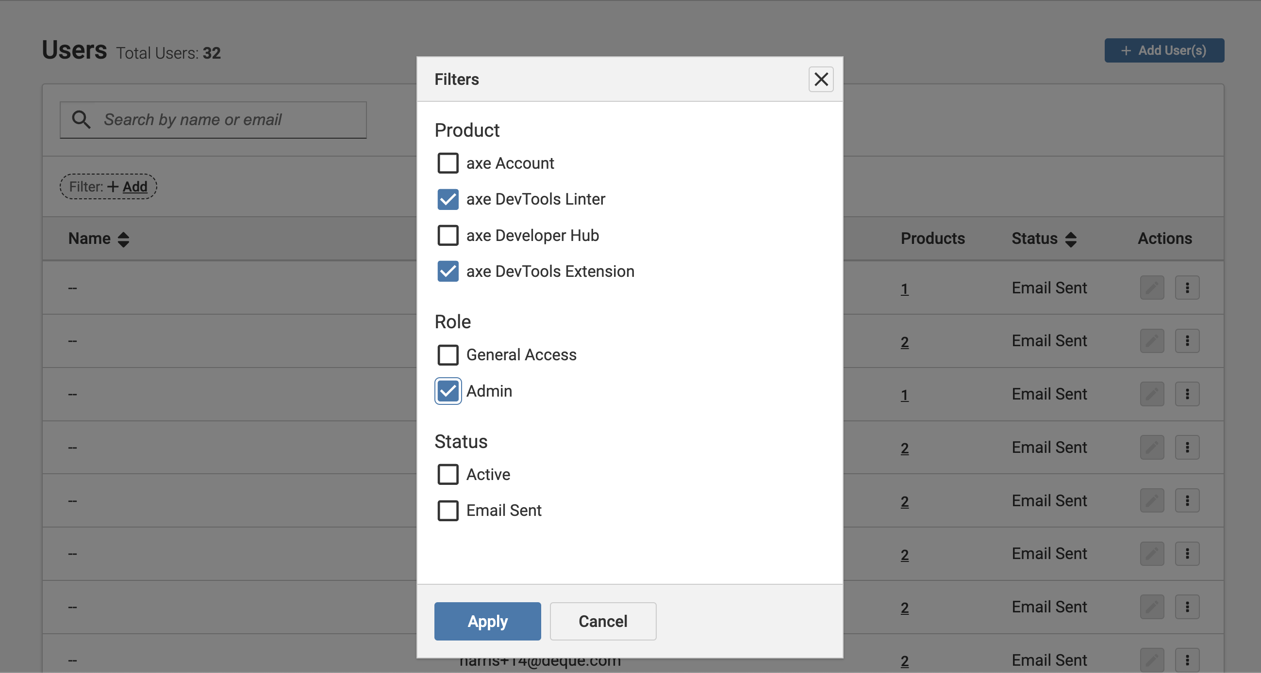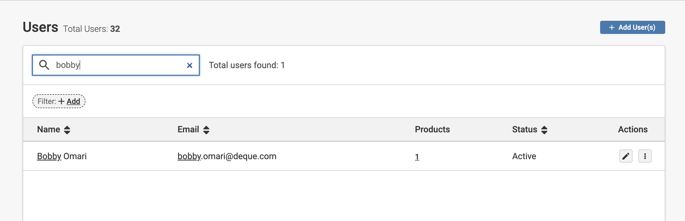 Admins can filter the user table by any combination of Product, Role, and Status. The product filters will filter users by access to the given product. If multiple products are selected, users who have access to any of the selected products will be returned. If 1 or more products are selected in addition to a role, only users who have the selected role who have access to any of the selected product will be returned.