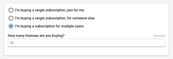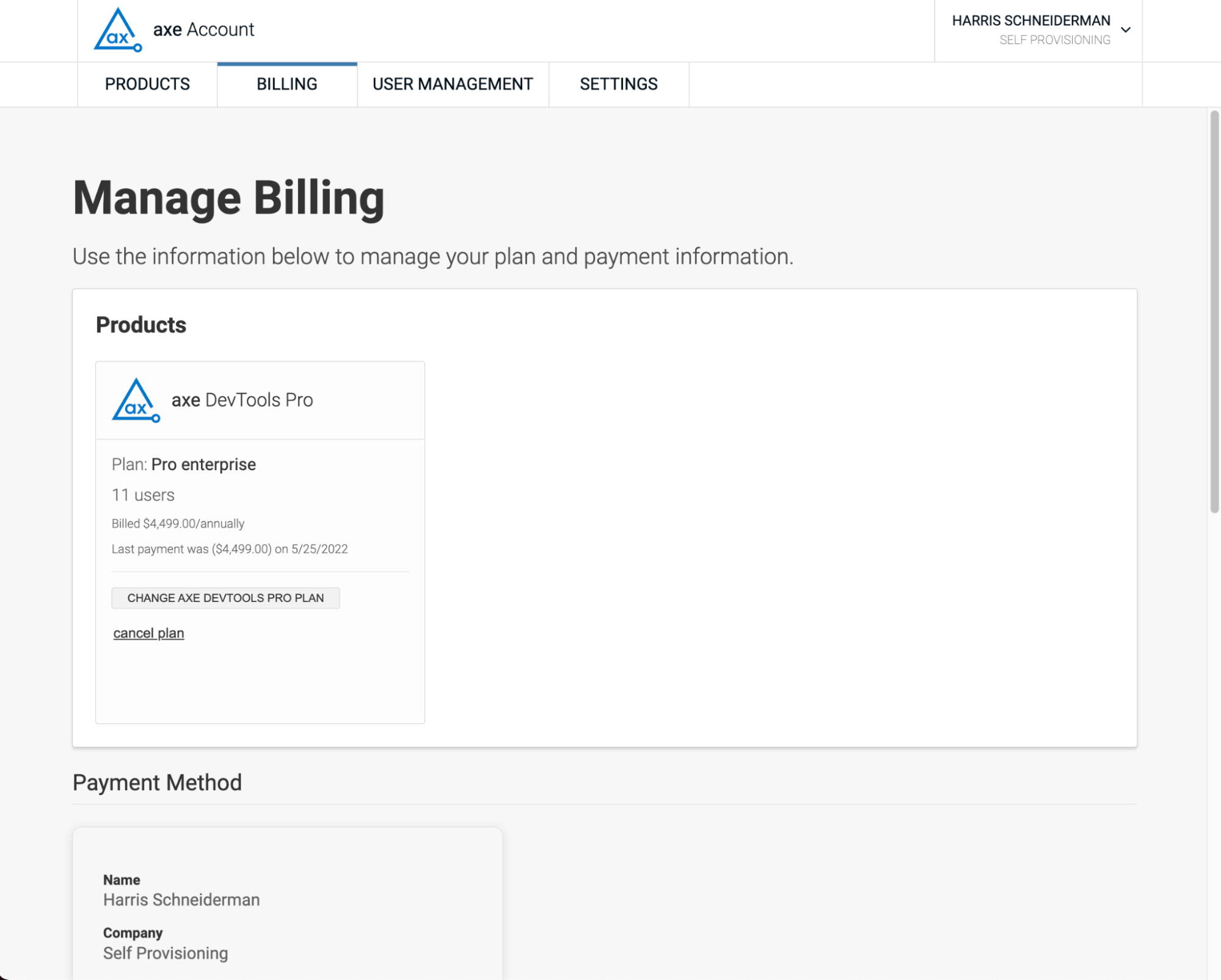 For subscriptions purchased offline, administrators will not be able to manage billing information in the axe Account Portal. This means that the payment method, company info, and invoices will not be available to be viewed or altered. In addition, admins for enterprise subscriptions purchased offline will not have access to directly change the subscription (license count, etc.) in any way within the axe Account Portal. Instead offline administrators can reach out to their Deque contact to change billing and subscription information.