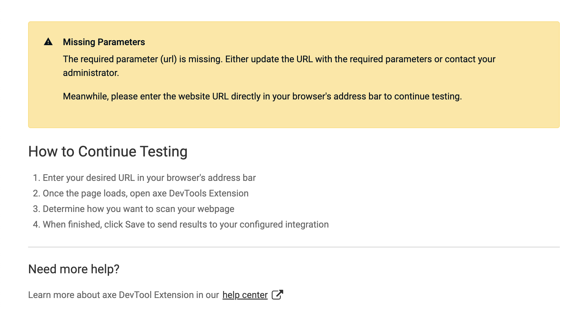 /axe-devtools/test-setup?testId=1234567&url=https%3A%2F%2Fworkshop.dequelabs.com - The axe DevTools Extension will automatically pick up on the testId and will queue up the testing to be performed