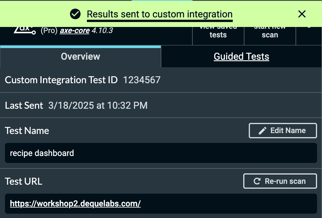 The custom integration allows teams to easily send entire test data from the axe DevTools Extension directly to a configurable webhook endpoint. This allows you to standup a custom webhook endpoint which can consume axe DevTools test data.