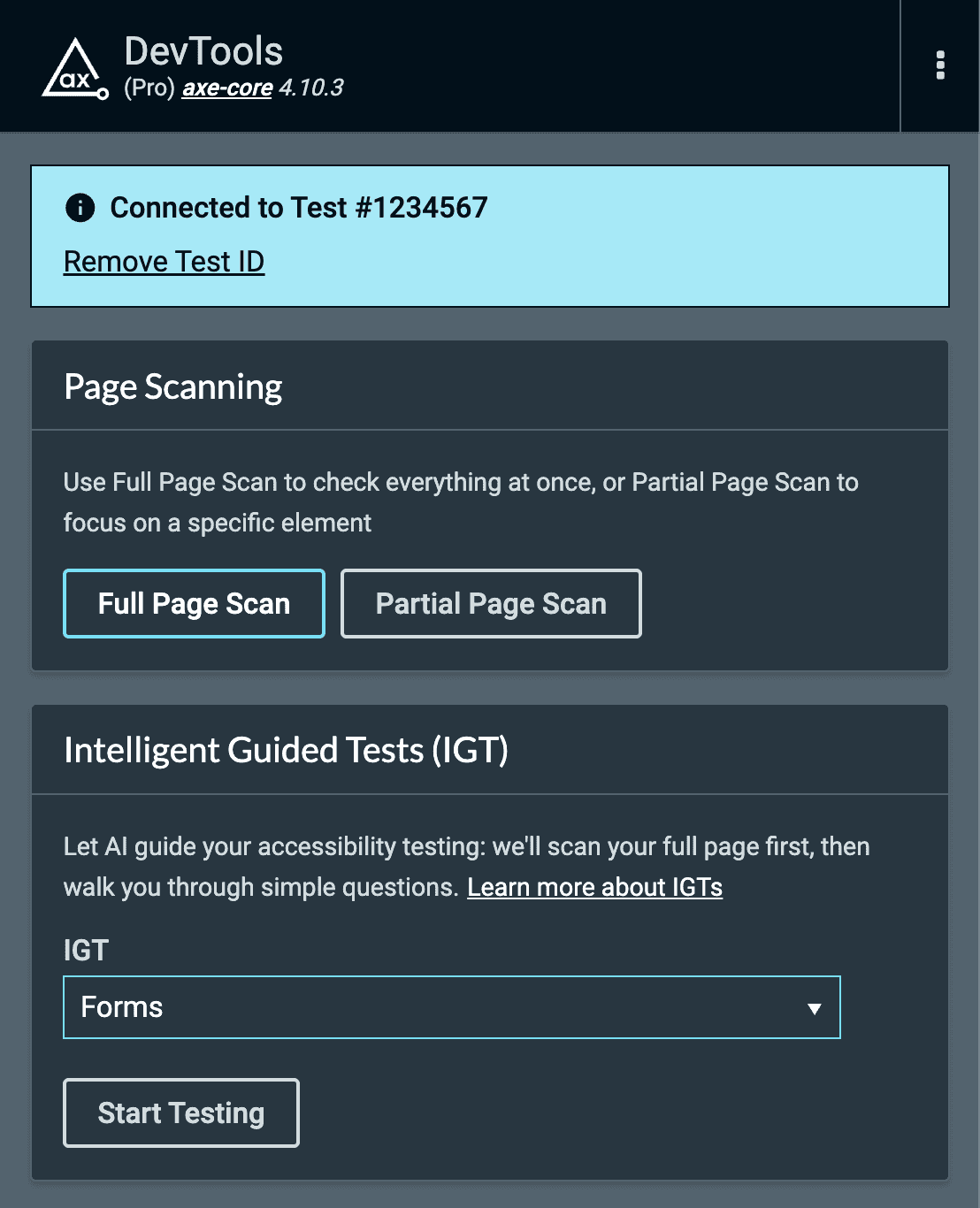 - Choose "Full Page Scan", "Partial Page Scan", or any IGT to begin testing