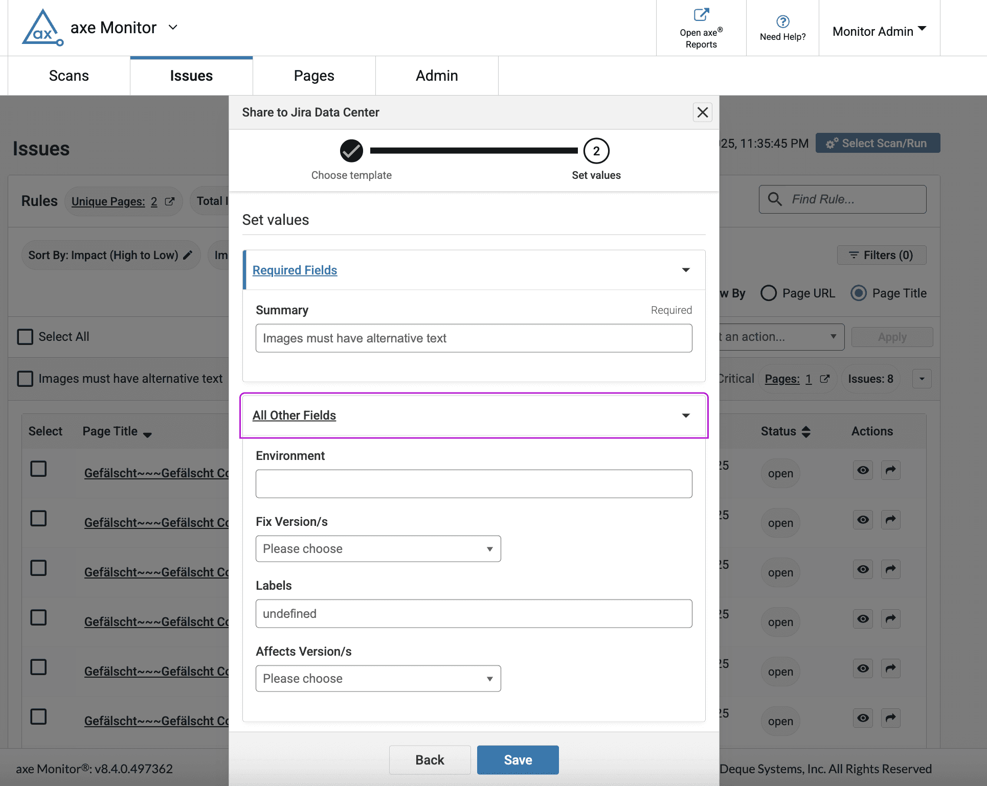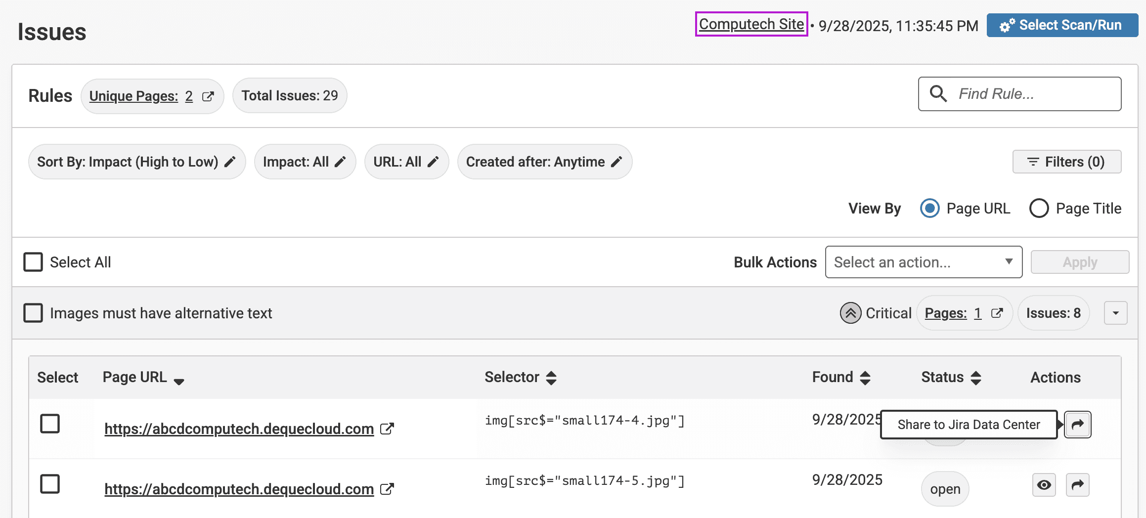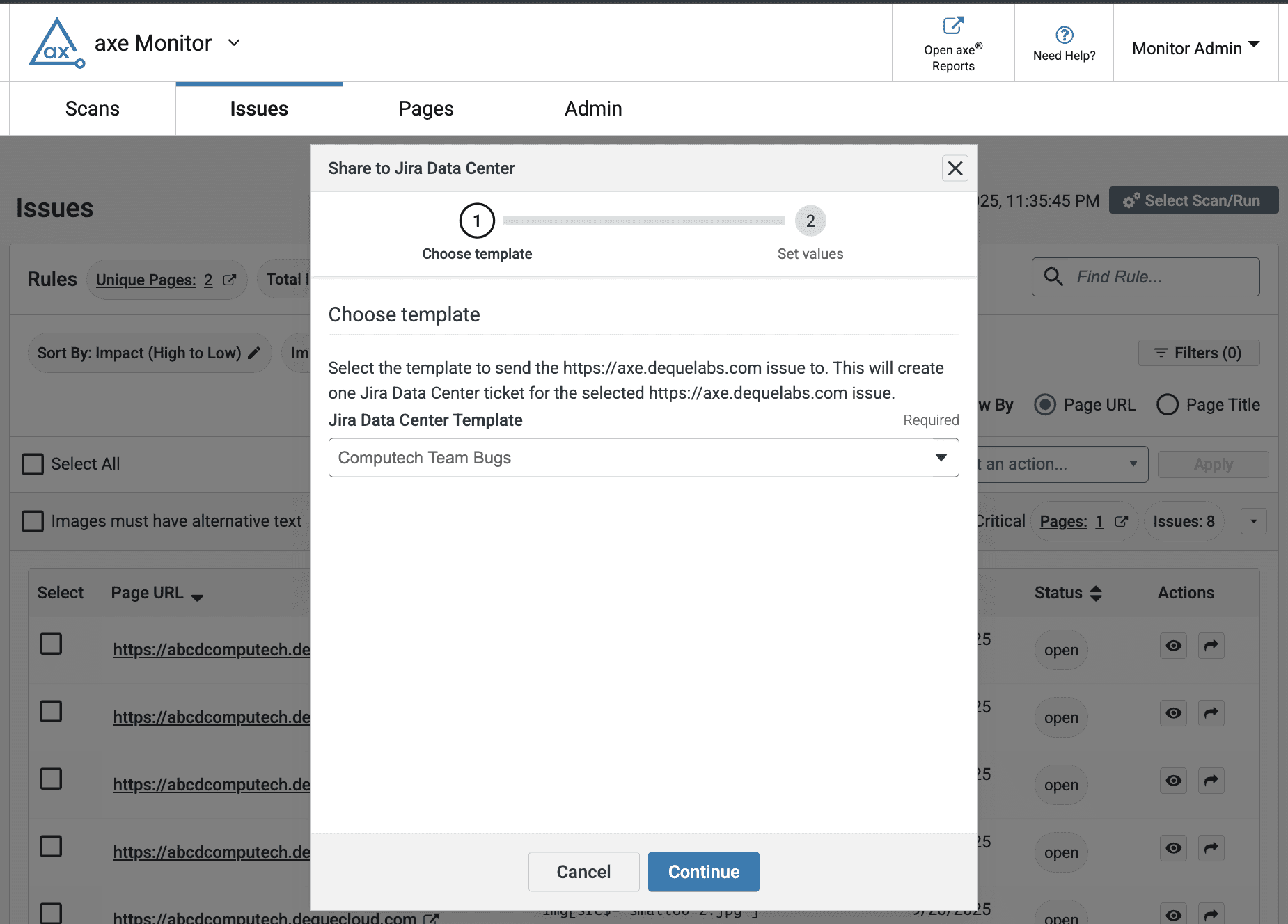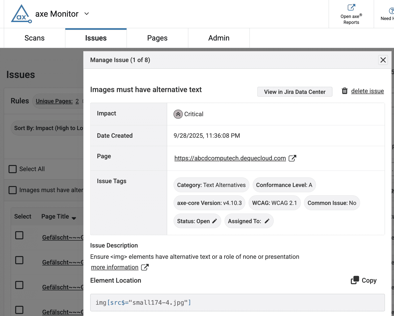 Once an axe Account admin for your organization has set up a connection to Jira and created a template, scan admins in axe Monitor can send axe Monitor issues to Jira.