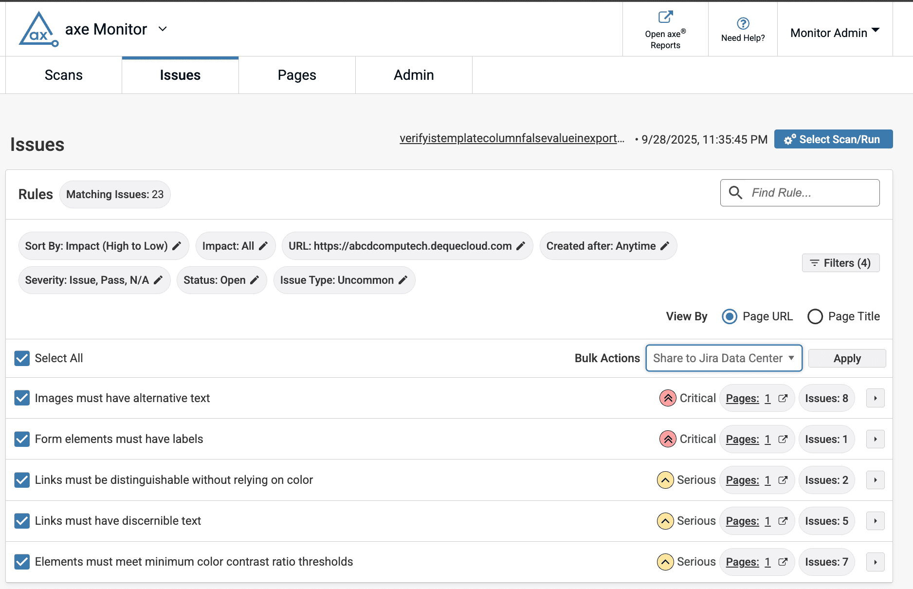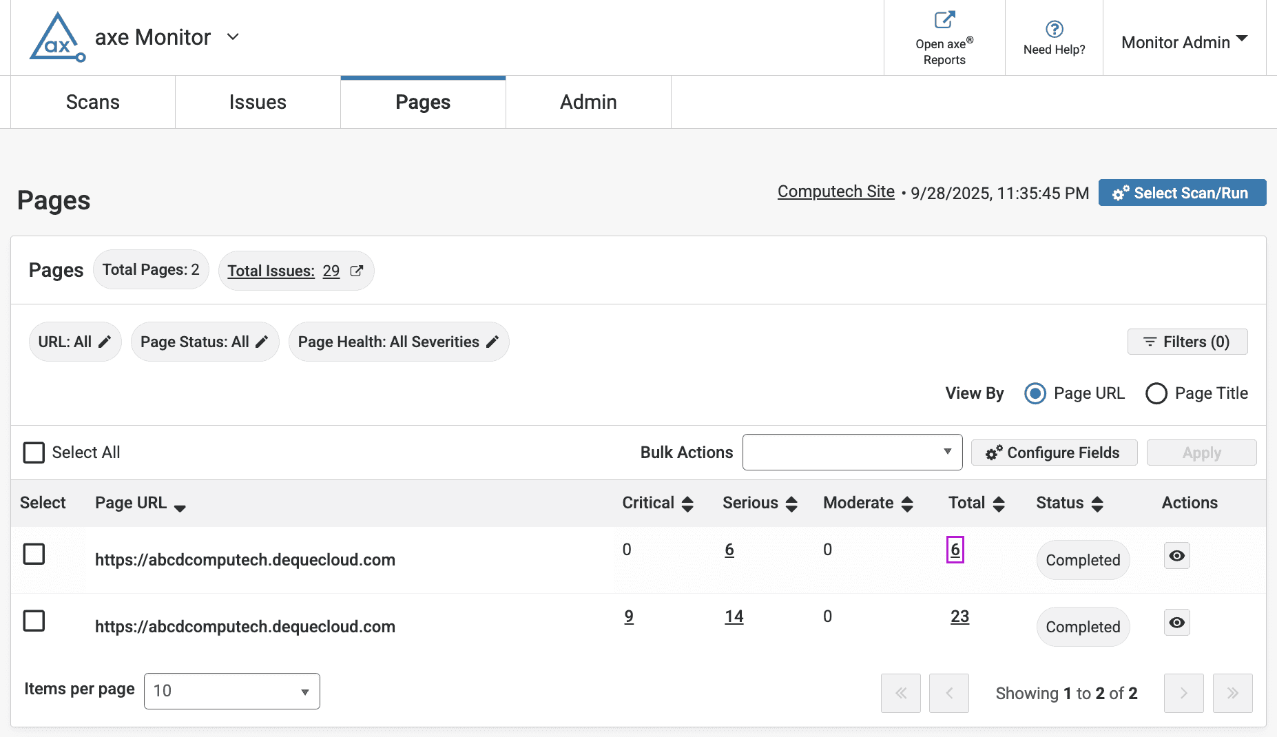 On the Pages view, select one of the issue counts for a page from the Critical, Serious, Moderate, or Total columns.