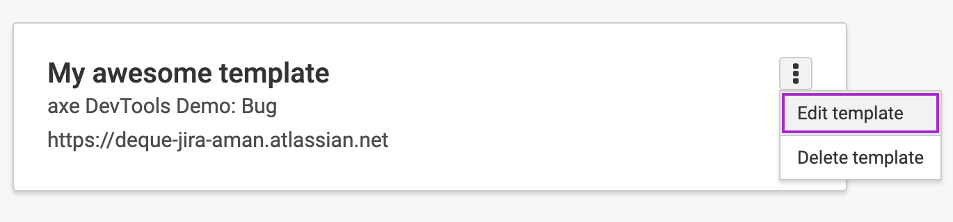 Templates are preset mappings of axe issue fields to Jira fields that help create standardized formats for Jira tickets. Templates can be created for any project and issue type pairing and can be used by anyone in your organization when sending issues to Jira.