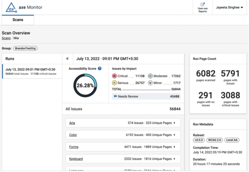 A new screen, Scan Overview page in the Experimental View allows the users to access the most recent six successful scans in one page. The main body of the page comprises the following main sections - details of the scan runs, accessibility score graph, issues by severity, needs review, details of all issues, a page count of the scan runs, and the last scan run's metadata.