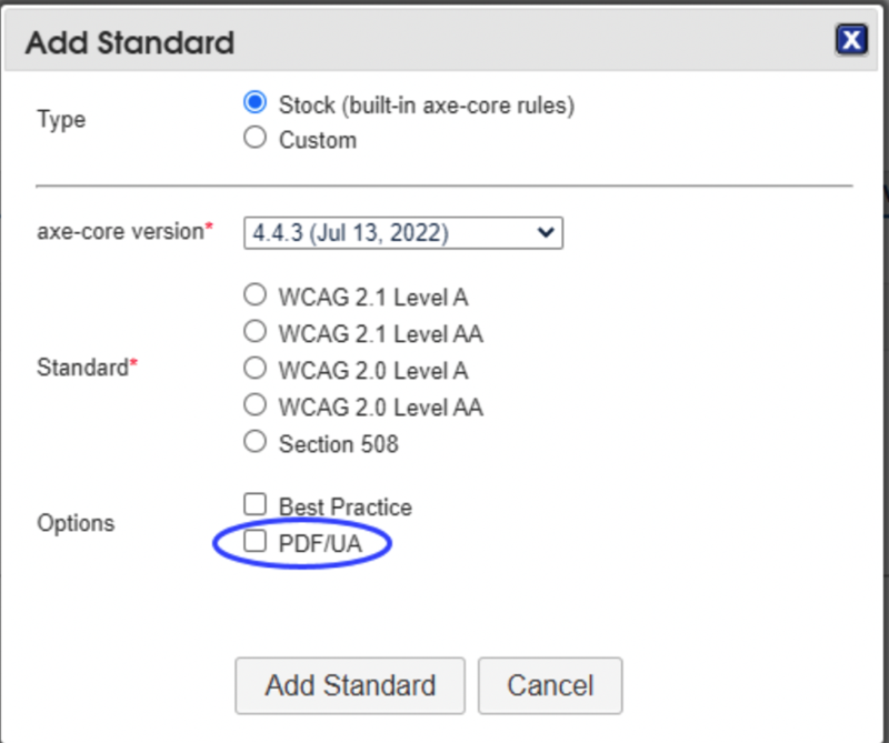 PDFs will always be validated against WCAG rules. A new testing standard option is available to enable PDF/UA rules.IMPORTANT NOTE: Because of additional checks, the scores for PDF documents may change in your existing scans. This can lead to a reduction in project scores.