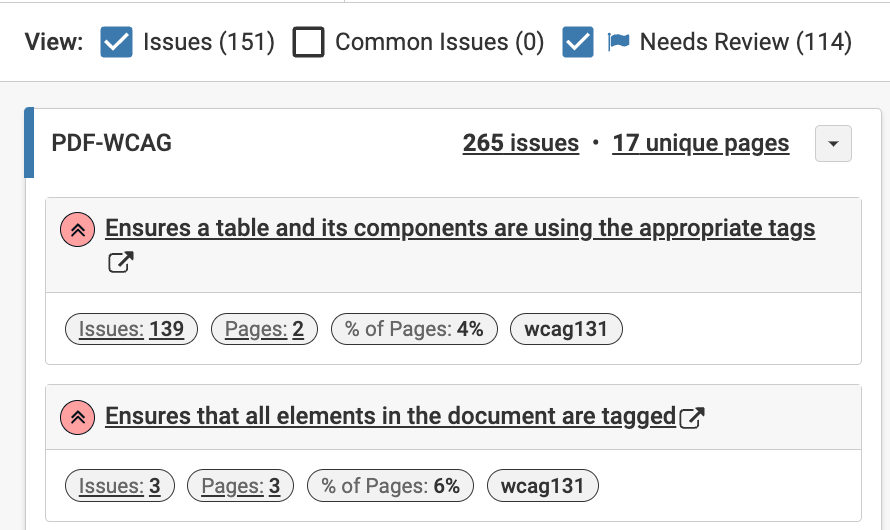Selecting the checkboxes displays a list of issues with information such as the number of issues, the total number of unique pages scanned, the WCAG rules applied. Clicking the link displays detailed information about the axe rule.