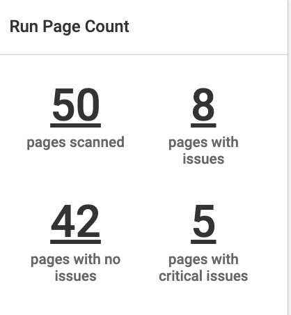 This section displays the cumulative count of scanned pages, pages with issues, pages that have no issues, and pages with critical issues. Clicking on the count directs you to the Pages page with the applied filters.