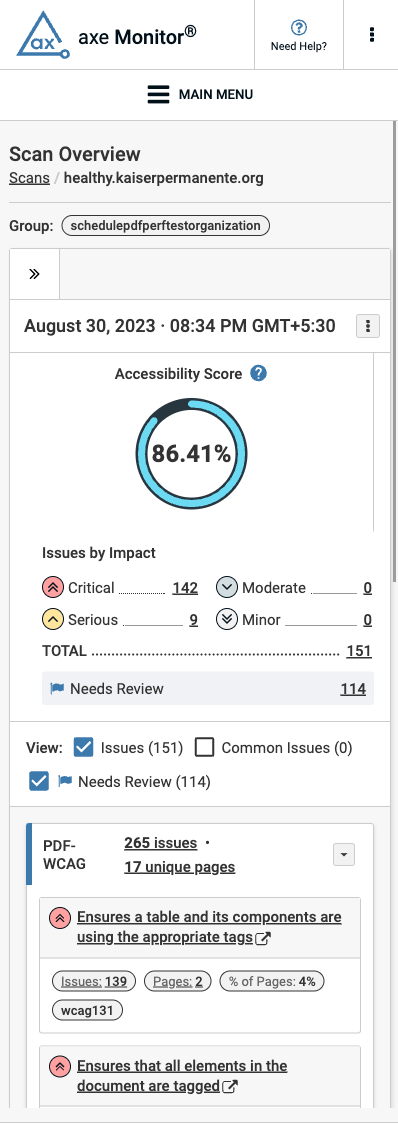 - Issues are categorized as Critical, Serious, Moderate or Minor.