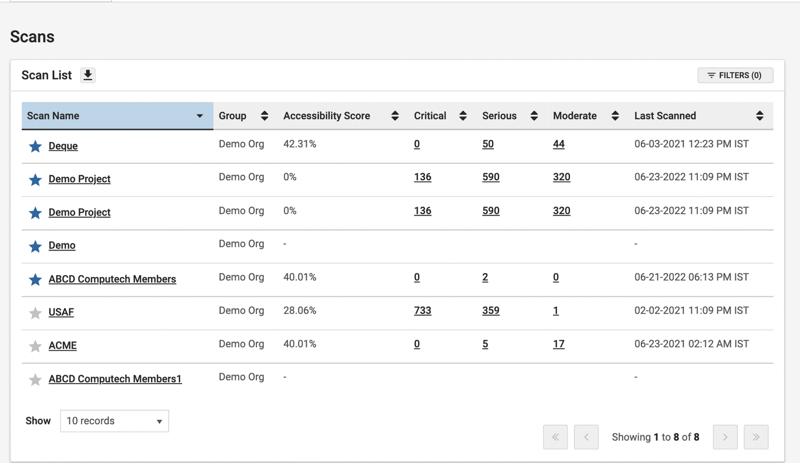 | Accessibility Score | The Accessibility Scores are calculated taking into account factors such as total number of pages, number of issues and severity of the issues. (See the Project Dashboard help page for more information about how scores are calculated.) The next three columns help view and sort the scans with varying degrees of severity, and the values - critical, serious, and moderate. The severity of the issues represent whether they are blockers or just issues marked as Needs Review that can be checked by human testers. Note: The columns can be sorted only in the desktop. |