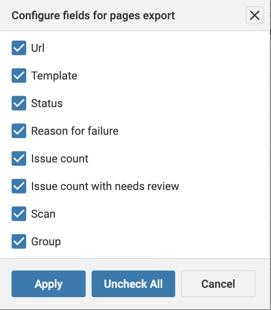 - Select the checkboxes to configure the fields to export the pages, and click the Apply button.