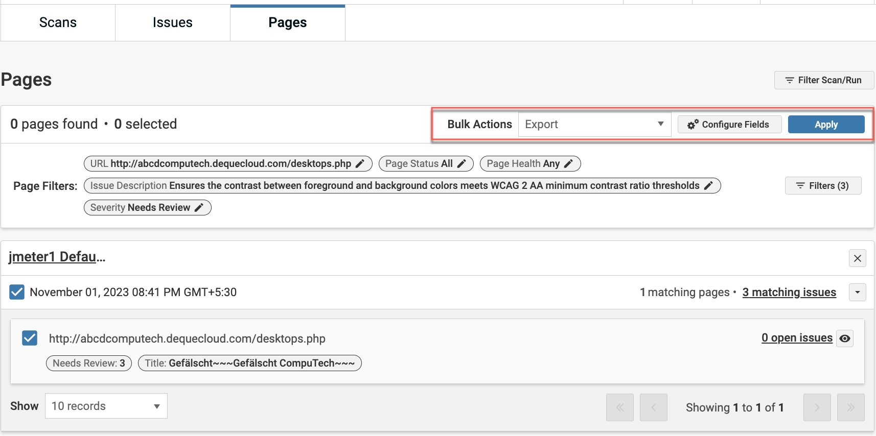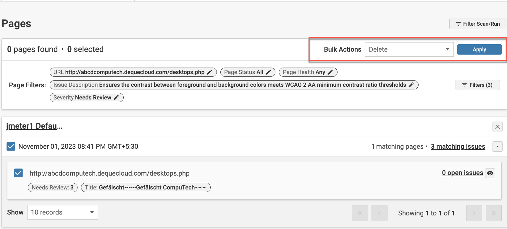 Filter the Scan/Run results to show pages related to your chosen scan runs. Select the specific pages you wish to apply bulk actions to from the list of displayed pages.