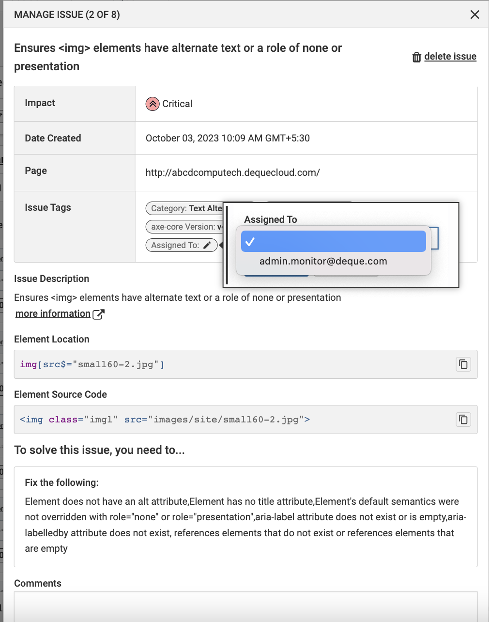 | Element Source Code | A snippet of source code for HTML issues. Use the copy button to copy the element source code. |