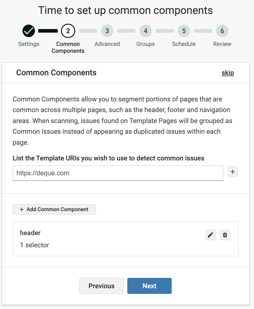 Common components enable you to segment parts of pages that are shared across multiple pages, like headers, footers, and navigation areas. During scanning, issues detected on Template Pages are grouped as common issues rather than appearing as duplicate issues on each page.
