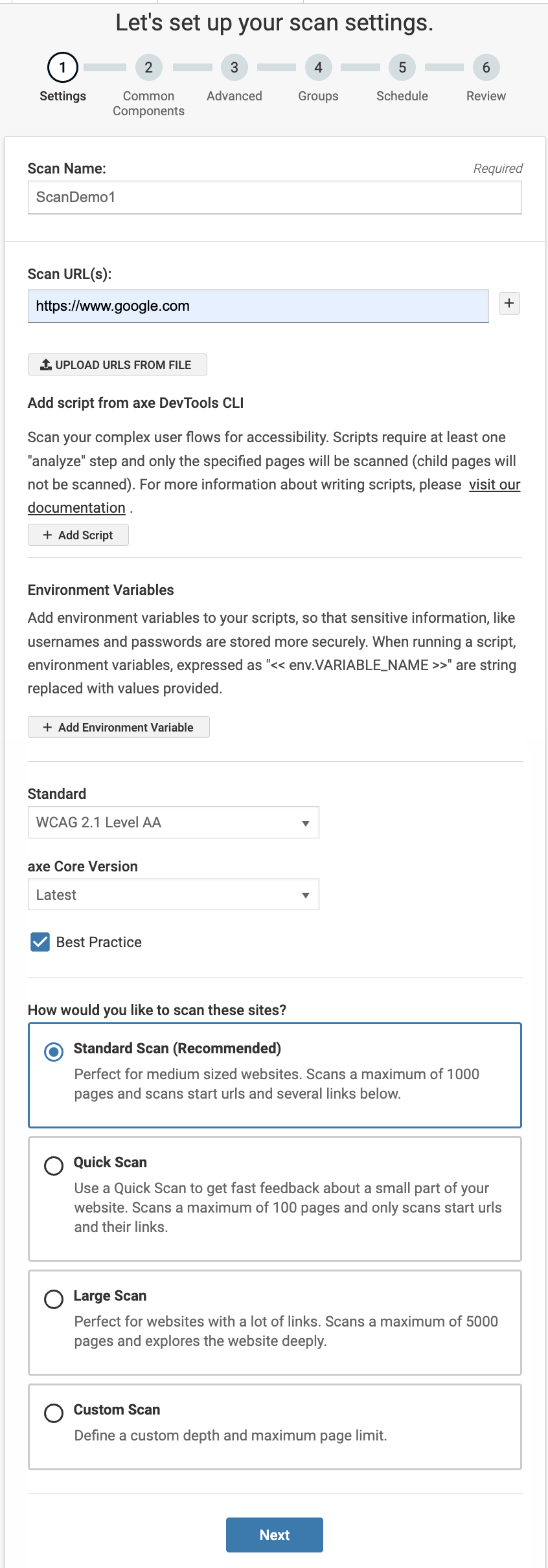 - Standard Scan (Recommended) - Ideal for medium-sized websites. Scans up to 1,000 pages, including the start URLs and several linked pages.