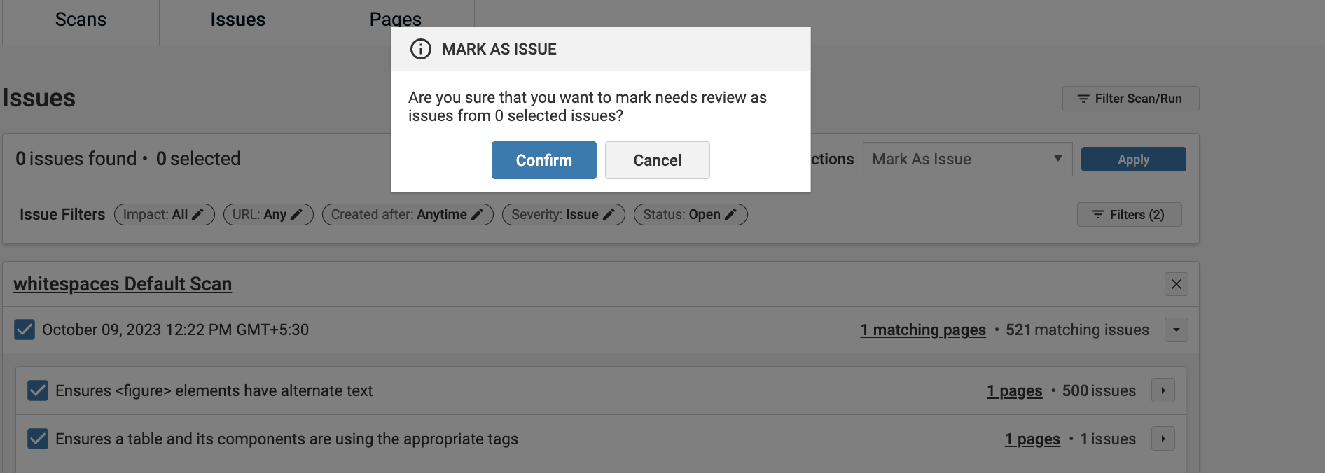 Para marcar resultados como problemas, seleccione los resultados y elija Marcar como problema en el menú desplegable Acción masiva. Seleccione Aplicar y confirme su acción en la ventana modal.