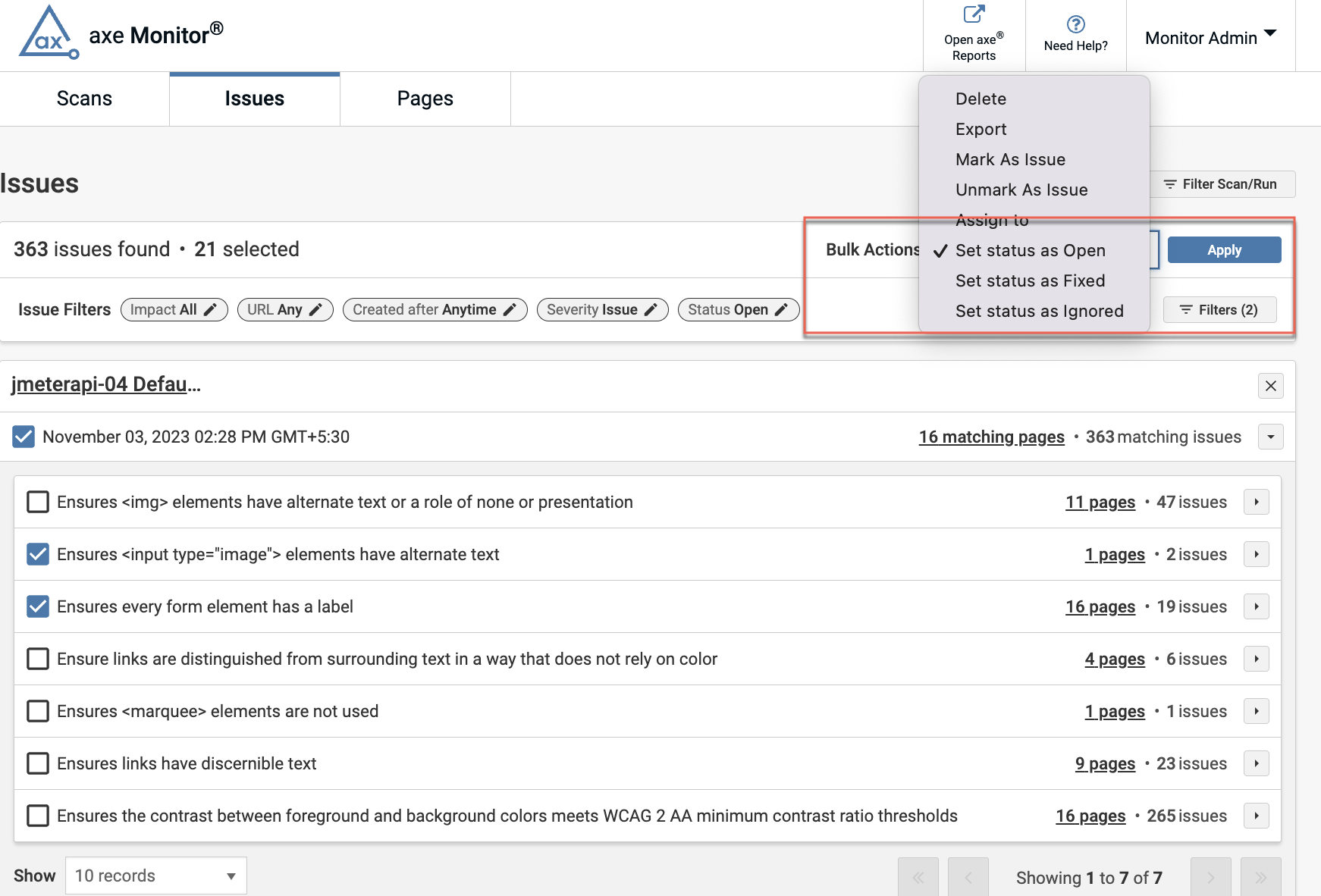 Para actualizar el estado, seleccione resultados y elija Abierto, Resuelto o Ignorado en el menú desplegable Acción masiva. Seleccione Aplicar.