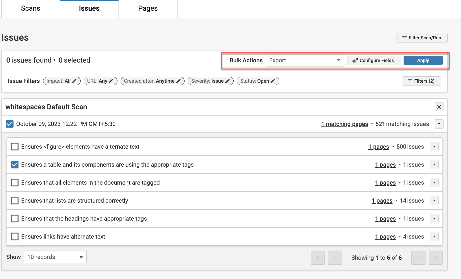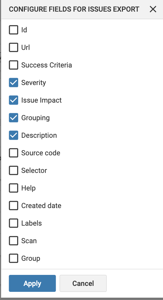 Nota 2: Para filtrar los problemas de accesibilidad de los problemas de mejores prácticas, exporte el informe utilizando la opción Detallado Antiguo . En el archivo CSV, los problemas sin un nivel WCAG o criterio de éxito son problemas de mejores prácticas.