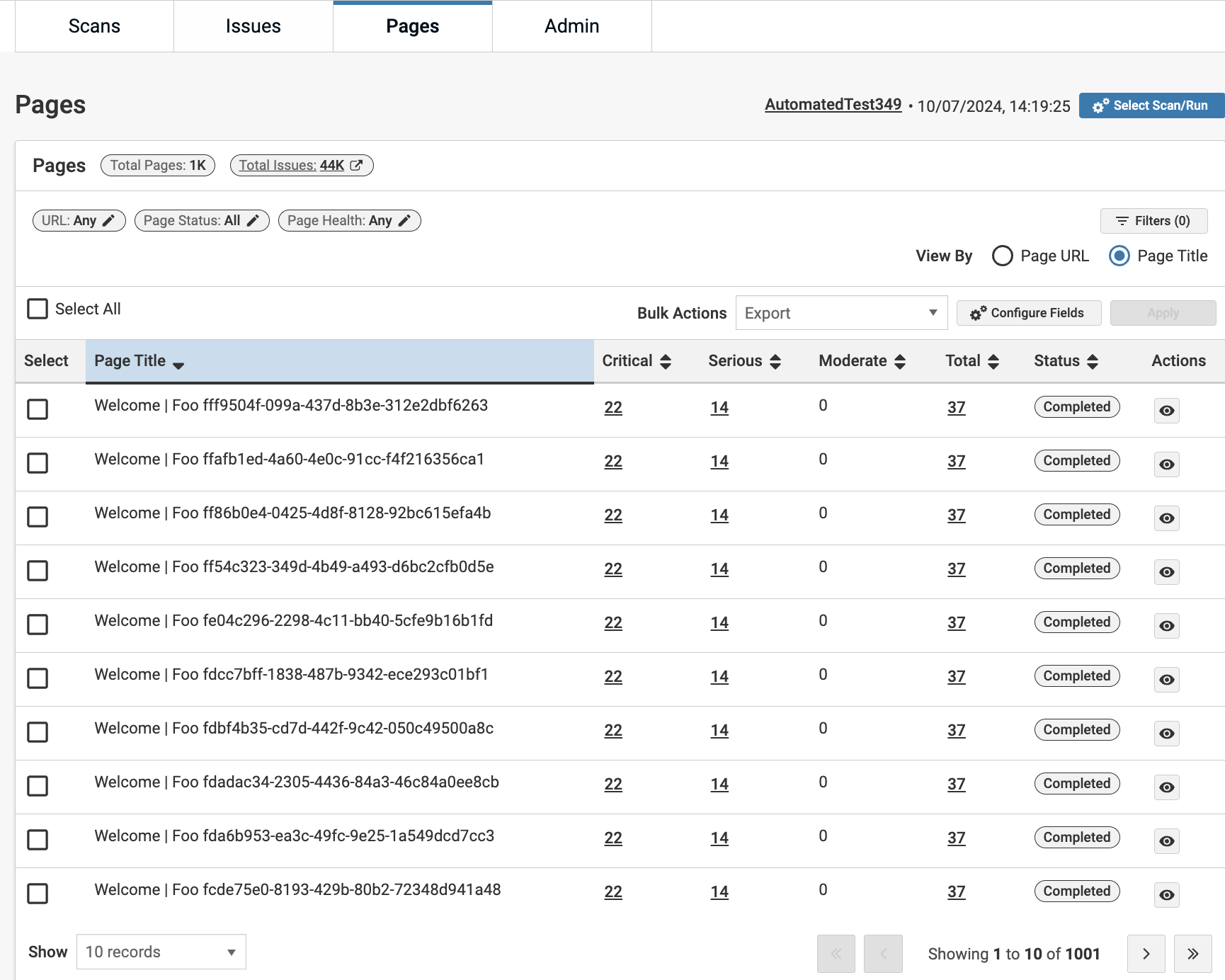 La vue Pages fournit une vue complète des pages analysées par axe Monitor, ajoutées manuellement ou téléchargées depuis l'extension axe DevTools. La page affiche les pages en fonction de l'exécution d'analyse sélectionnée.