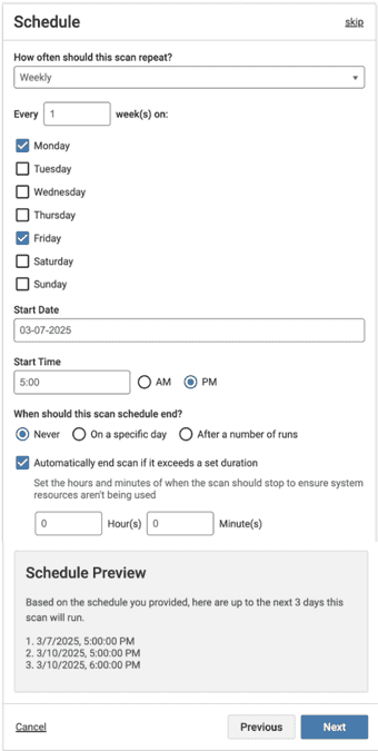 Scans can be run every week/month, or less frequently, such as every 2 or 3 weeks/months.