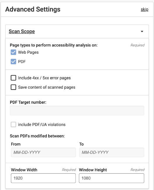 Advanced Scan Settings are optional. After filling in all the desired information, select Next. You can also choose to skip the step by selecting the Skip link.
