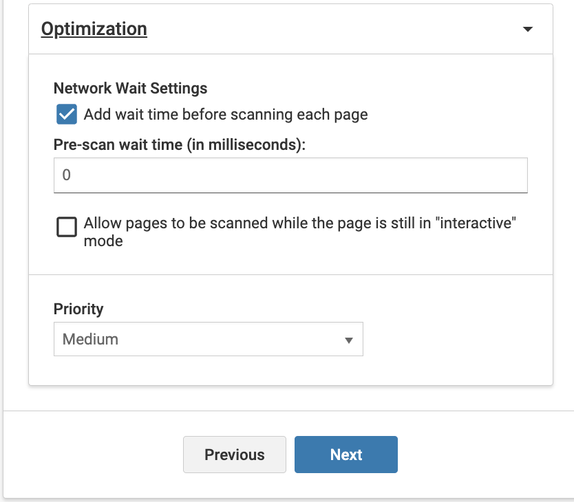 Add wait time before scanning each page: Select this checkbox to extend the amount of time that axe Monitor should wait before scanning each page. This setting is useful if you have pages that take a long time to load.