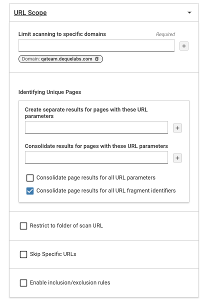 Consolidate page results for all URL fragment identifiers: Select this checkbox to exclude all URL parameters during the website scan. Doing so will disables the previous two fields. URL fragments are used to identify specific portions of a page.