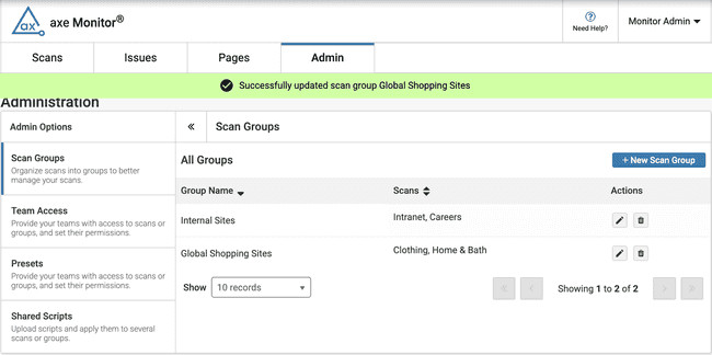 Use the Scan Groups tab in the Admin page to better organize your scan groups. Scan Groups can be edited and deleted from this page, too. You can also use the +New Scan Group button to create scan group and add scans and teams to the scan groups.