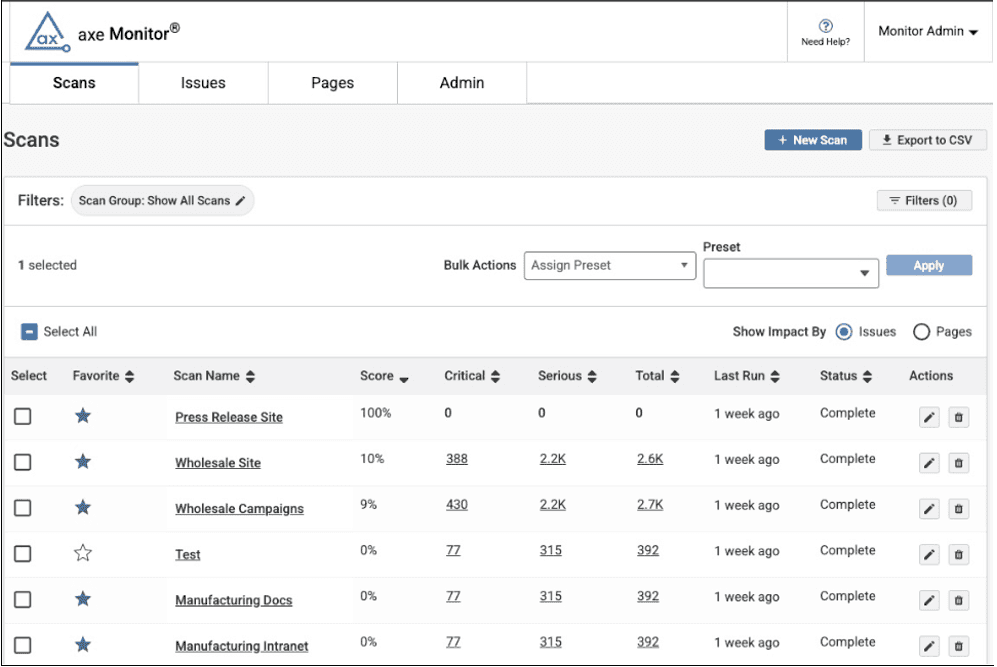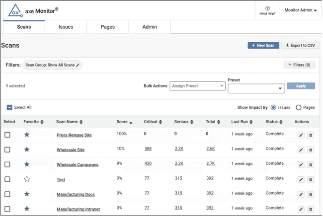 When you log into axe Monitor, the Scan List provides a birds' eye view of all the scans you can access in the system. The Scan List displays all the scans you have access to, with scans marked as Favorites sorted by default. Each scan has a scan name, score, critical issues, serious issues, total issues, last run, and scan run status. Users who have permission to edit or delete the scan, those actions are displayed in the Actions column. The issue counts are linked, and provide direct access to filters. For example, a count of “100” in the Critical column will lead you to the detailed list of 100 Critical issues found for that scan.