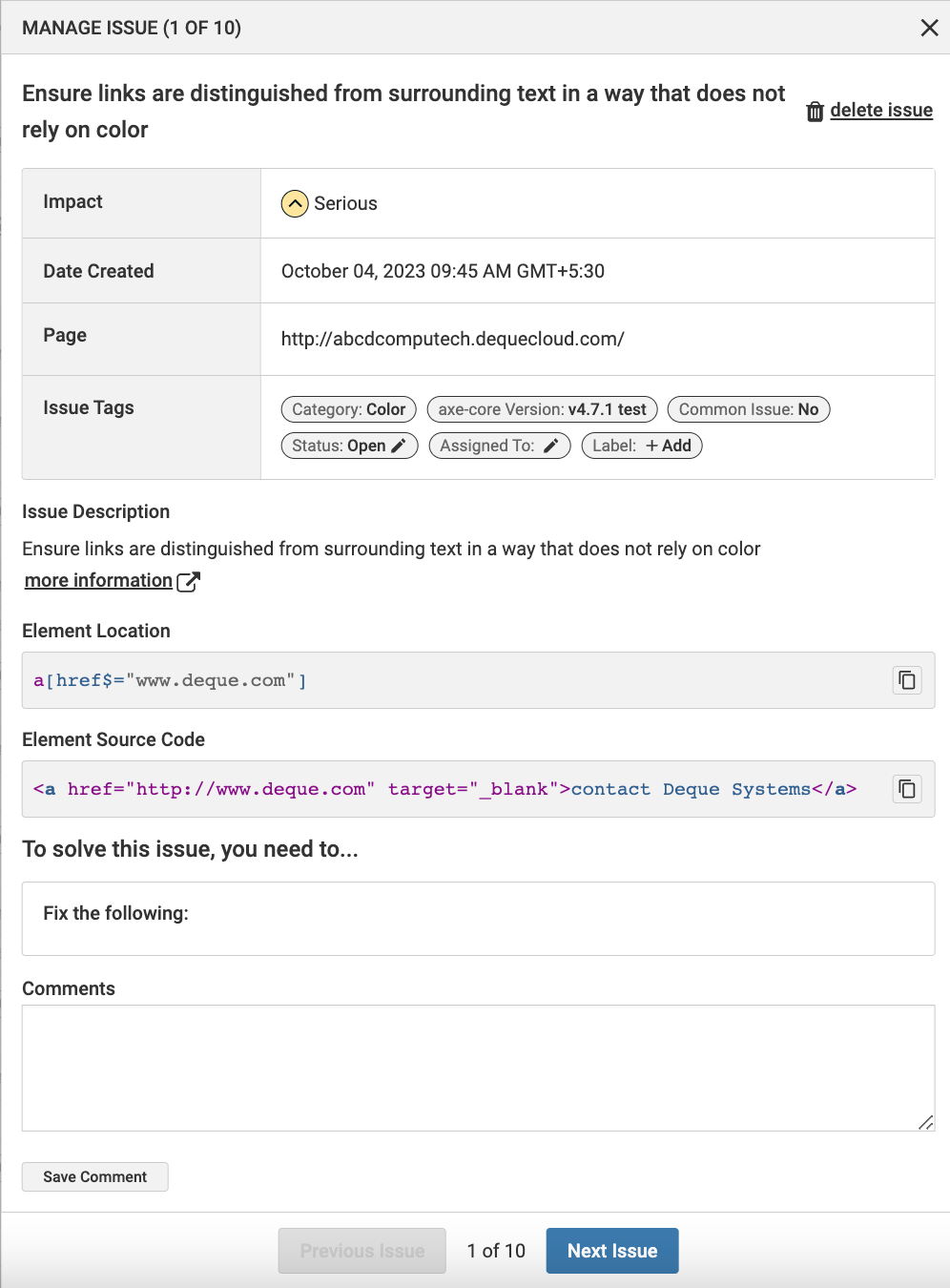 | Kommentare | Fügen Sie alle relevanten Notizen hinzu und wählen Sie Kommentar speichern aus. Benutzer, die Zugriff auf diesen Scan haben, können Ihre Kommentare überprüfen. |
