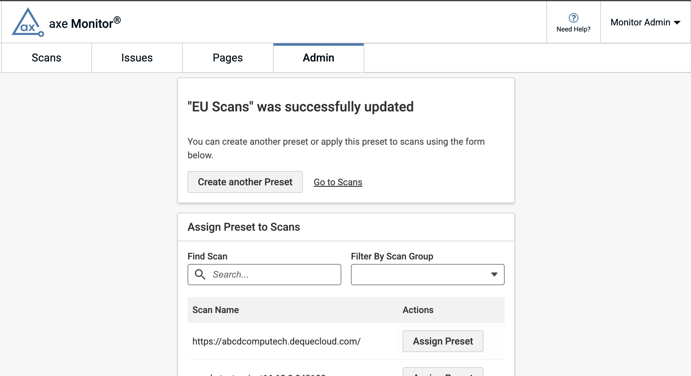 Le preimpostazioni consentono agli amministratori di axe Monitor di creare un modello di impostazioni e di applicare tale modello a più scansioni o gruppi di scansioni.