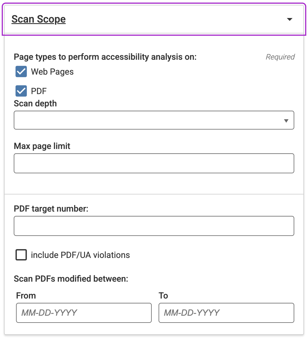 Esegui la scansione di pagine web, PDF o entrambi. Selezionare la/le casella/e di controllo corrispondente/i. Devi selezionare almeno un'opzione.