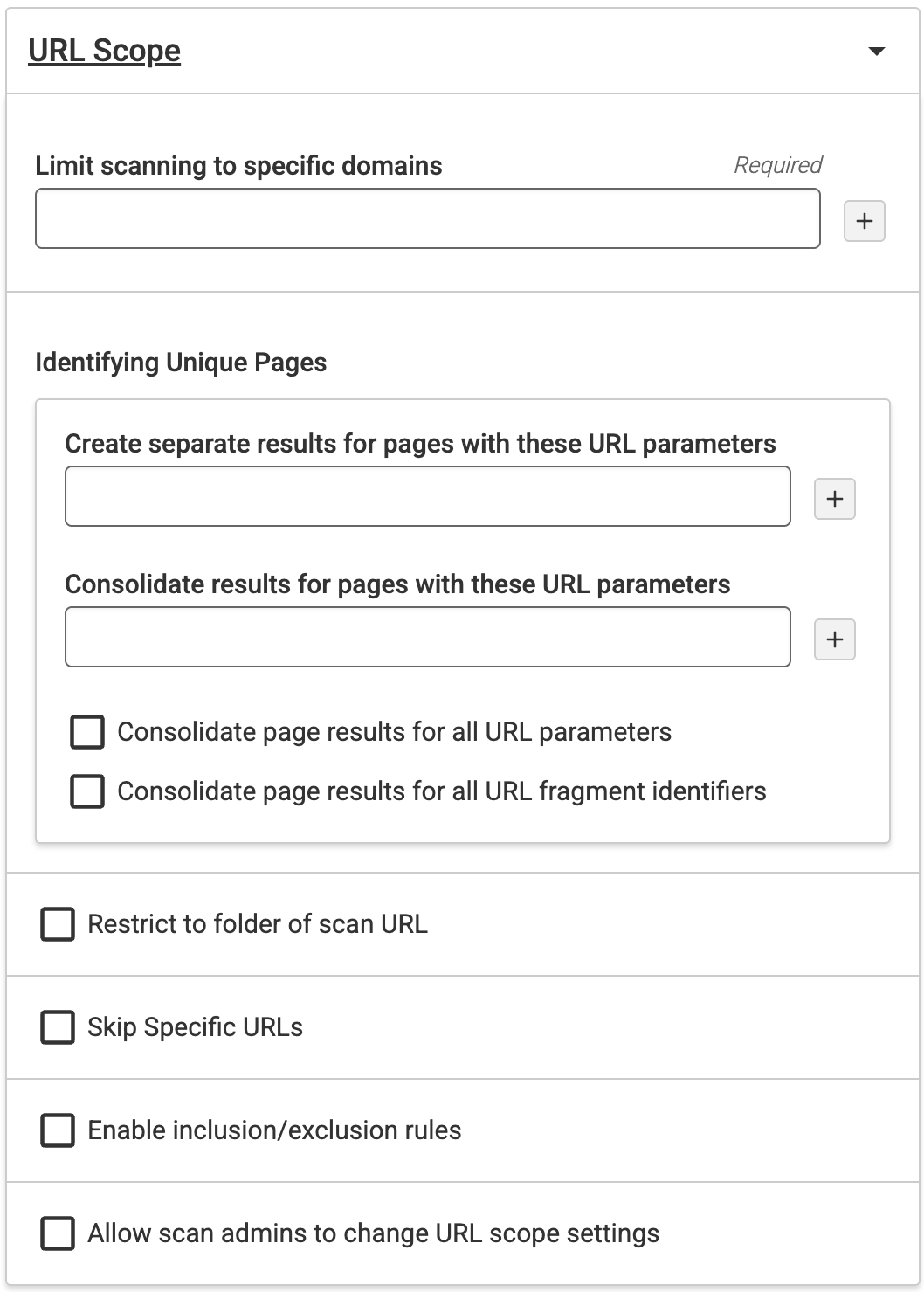 Consolida i risultati della pagina per tutti i parametri URL: Seleziona questa casella di controllo per escludere tutti i parametri URL durante la scansione del sito web. Selezionando questa casella di controllo si disabilitano i due campi precedenti.