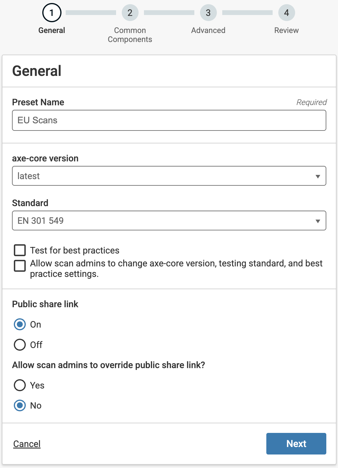 - Seleziona la casella se vuoi consentire agli amministratori della scansione di modificare la versione di axe-core, lo standard di test e se le migliori pratiche vengono testate.