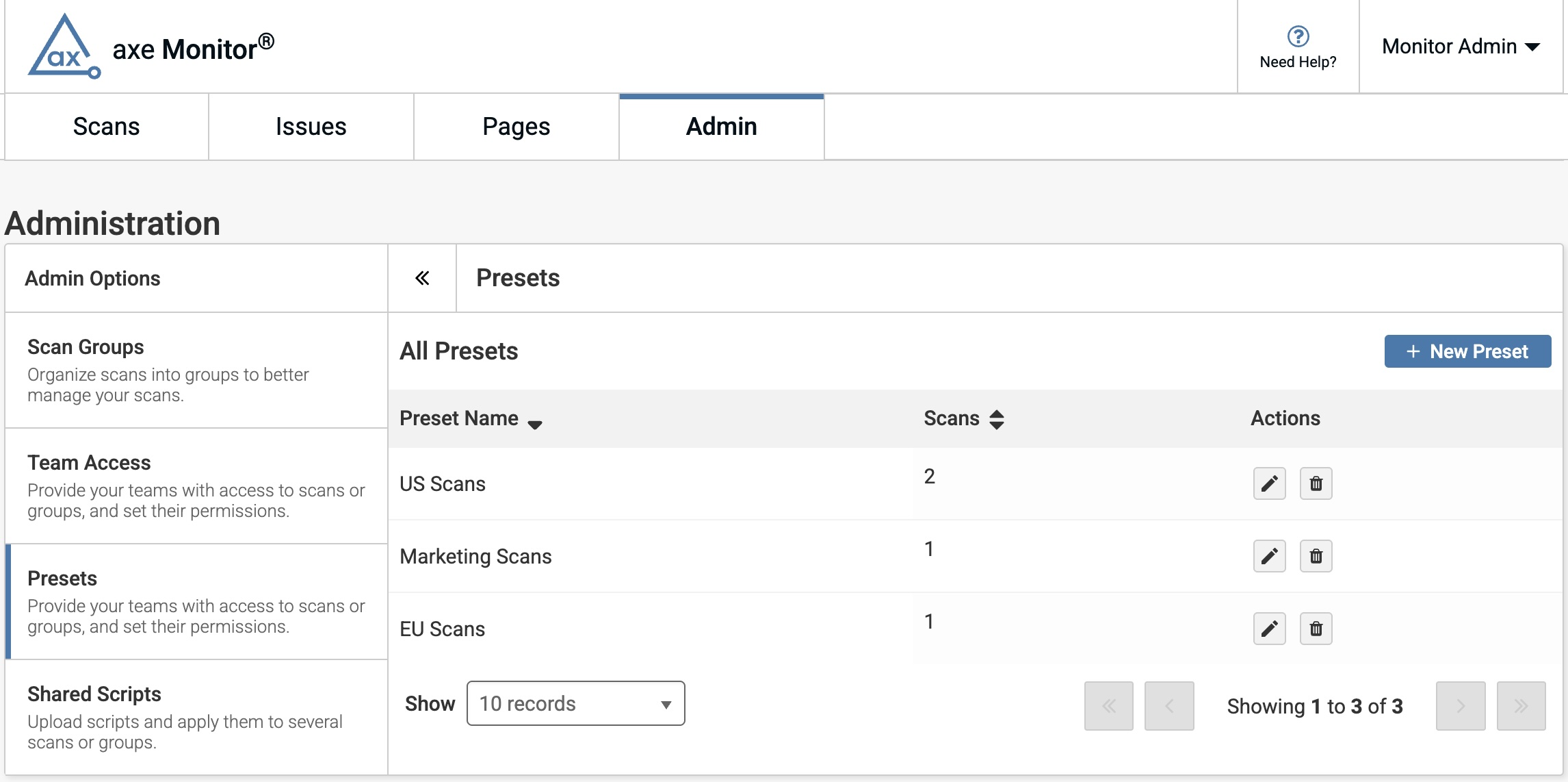 Nel pannello Preset nella sezione Amministrazione, gli amministratori di axe Monitor possono selezionare l'icona della matita sotto le azioni per modificare oppure l'icona del cestino per eliminare un predefinito.