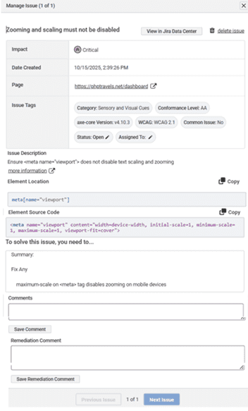 | Issue Tags | Category, Conformance Level, Testing Standard, axe core version, Common Issue, Status, Assignee. Status and Assignee are modifiable. |
