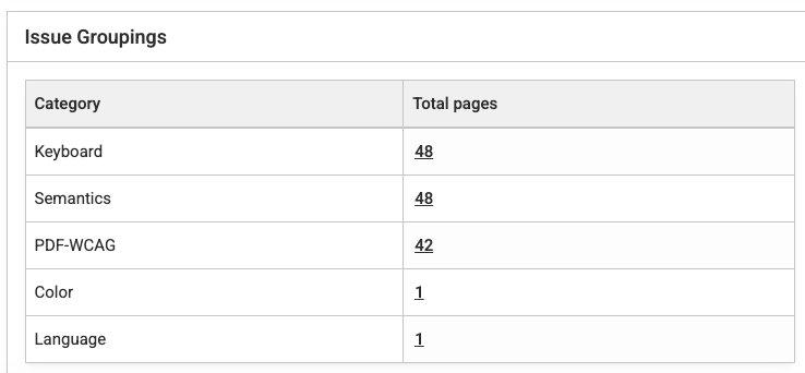 Pages are categorized as Critical, Serious, Fair, or Good based on the most impactful issue on the page. That is, if a page has one Critical issue, the page is Critical; one Serious issue, the page is Serious; one Moderate issue, the page is Fair; and if a page only contains Minor issues, it is Good.
