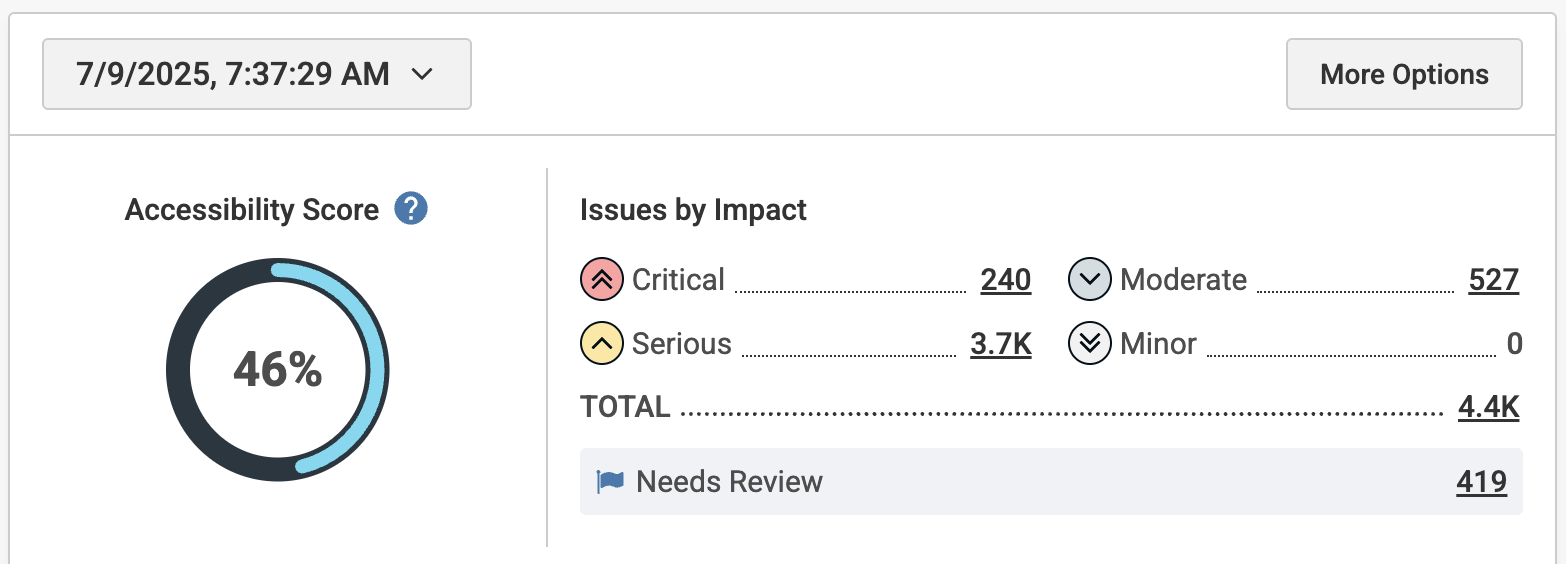 The Accessibility Score is displayed as a percentage and is calculated based on factors such as the total number of pages, the number of issues, and the severity of those issues. Accessibility Score is an average score for each page in the project, with scores assigned as follows: 0% for critical issues, 40% for serious issues, 80% for moderate issues, and 100% for good accessibility.